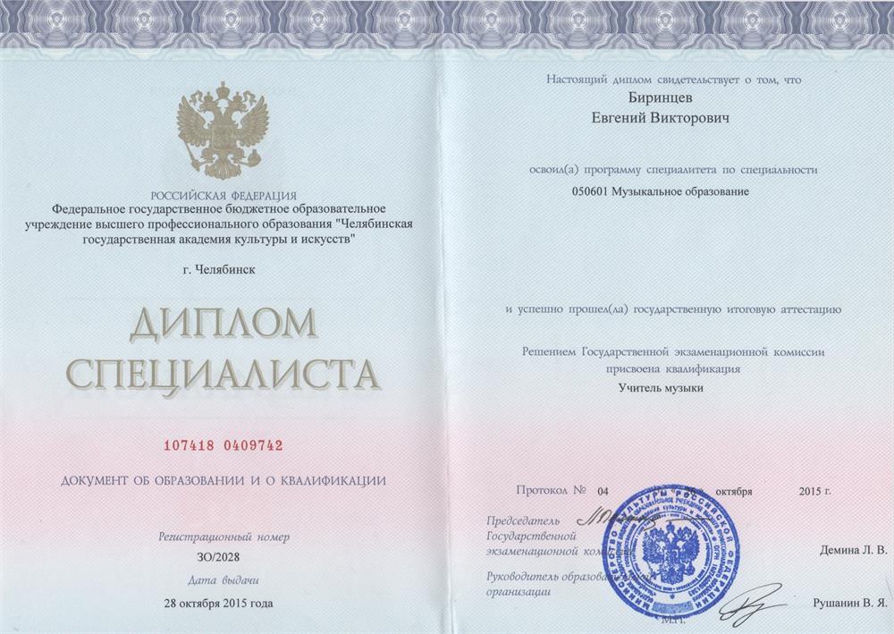 Квалификация - учитель музыки. Классическая гитара - класс заслуженного артиста России Ковбы Виктора Васильевича. Вокал - класс профессора Боровик Людмилы Григорьевны Дирижирование - класс профессора Булгаковой Светланы Николаевны