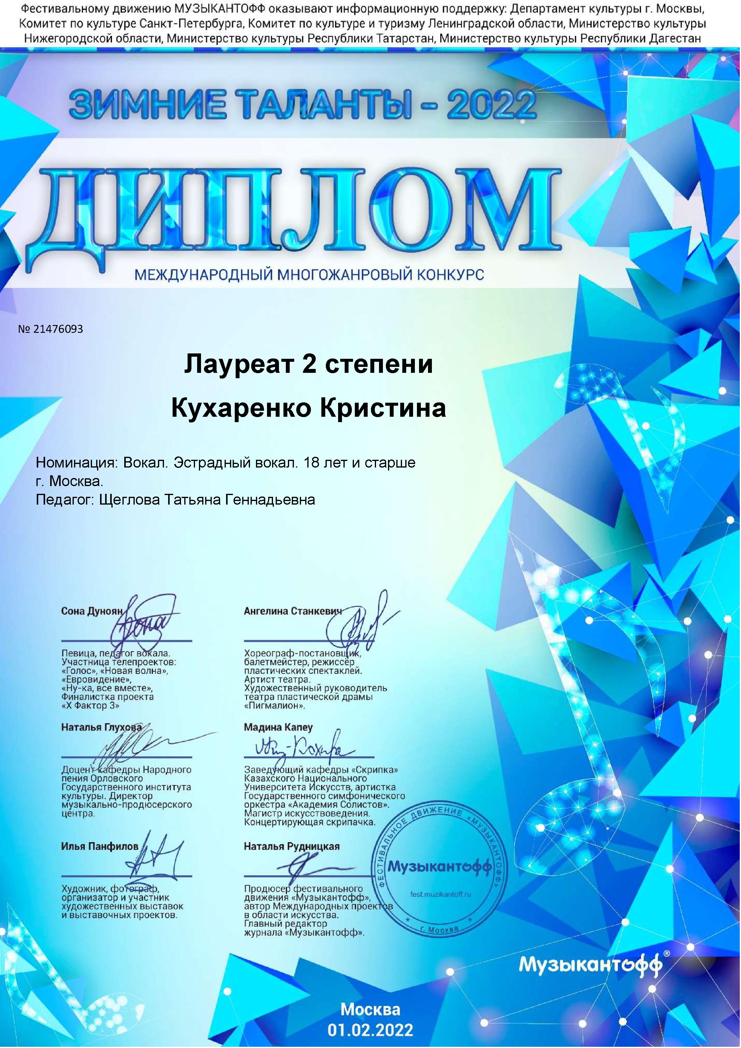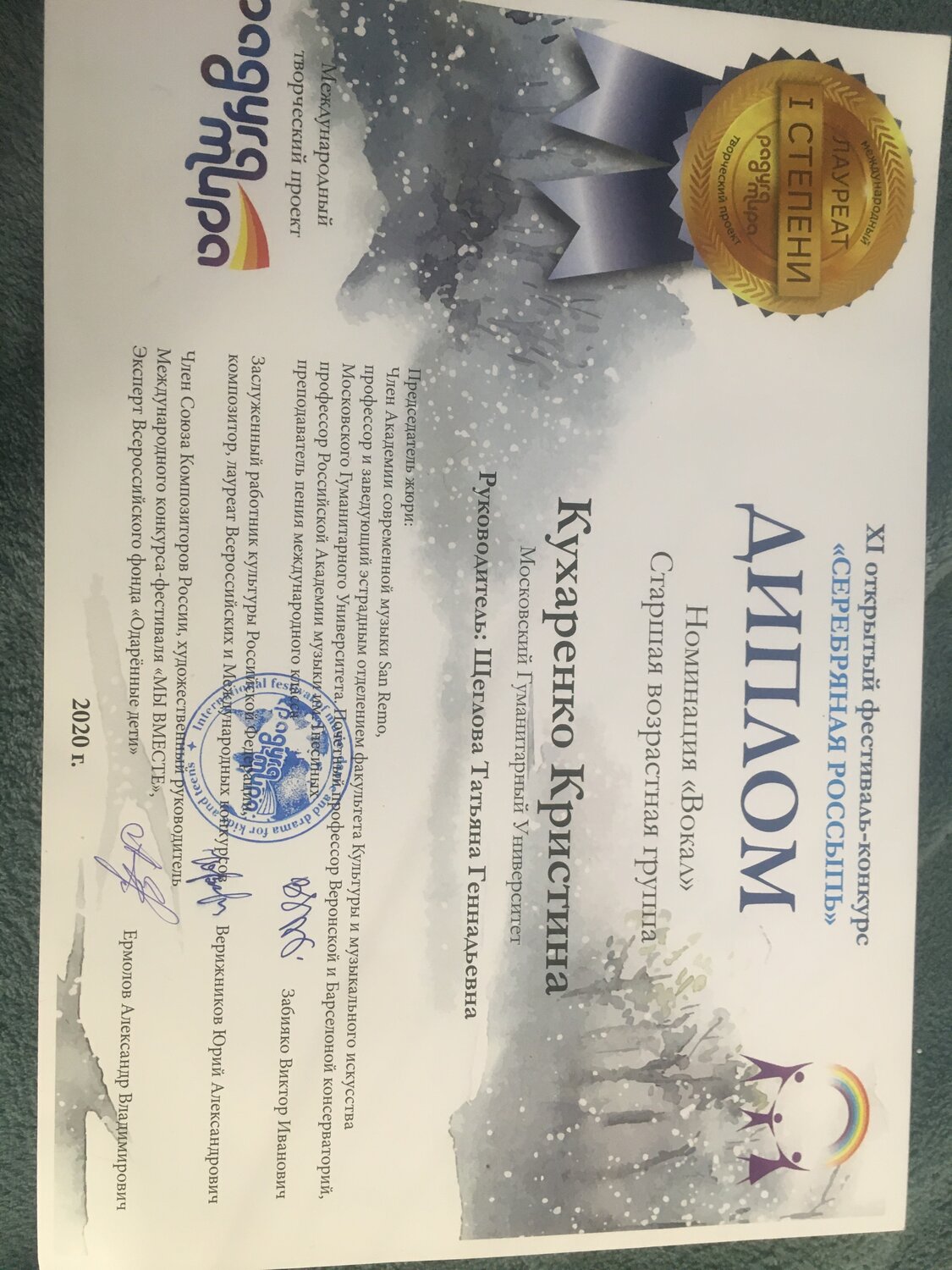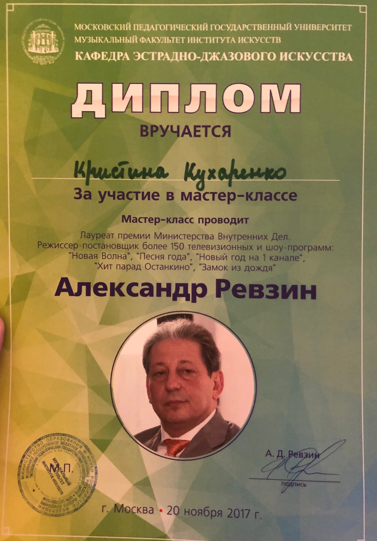 Меня зовут Кристина, я педагог по трем направлениям. Имею большой опыт в музыкальной сфере Мои ученики на первом году обучения получили лауреата международных конкурсов. А вы готовы получить такой же опыт?;) Есть желание через год оказаться в Вузе? На прослушивании расскажу, как к этому прийти. Обучаю как детей от 4 лет, так и взрослых. Если слышали в свою сторону фразеологизм "Медведь на ухо наступил" - бегом на занятия, буду исправлять! О себе: Занимаюсь музыкой с раннего детства. Первые несколько лет музыкальной школы оканчивала экстерном по классу фортепиано, потом перевелась на вокальное отделение, продолжая развивать свои навыки игры на пианино. Обучалась в академии Яны Рудковской по направлению эстрадно-джазовое пение и хореография. Очень приветствую учеников, которые мечтают научиться петь и играть на инструменте одновременно. А если есть желание овладеть клавишными без вокала - помогу! Учитываю пожелания ученика, подбираю индивидуальный подход к каждому В университете была хорошая подготовка как артиста: занималась танцами, сценической речью и движением, актерским мастерством. Пела в ансамбле, играла на фортепиано. Данные дисциплины помогают развить артистическую личность, о которой я писала в своем дипломной работе. Помимо этого есть знания в области фониатрии. Если нужно, расскажу вам почему мы слышим на себя на записи по-другому, или о строении голосового аппарат;) Благодаря этому освоение вокала у ученика происходит лучше! Подготовлю к конкурсам и к поступлению в училища/ВУЗы. Сама являюсь лауреатом и дипломантом различных Всероссийских и Международных конкурсов по вокалу и фортепиано. Кроме педагогической деятельности, я сотрудничаю с фондом поддержки культуры и спорта “Новые лица”. Четвертый год мы проводим фестиваль “Новые лица - прежние идеалы” в Государственном Кремлевском Дворце, делаем концерты в Доме Учёных, в парках и т.п. Именно поэтому нет никаких проблем в предоставлении вокальной практики своим ученикам! В 2020 году стала организатором фестиваля Визуальных искусств в "Орлёнке". Даю мастер-классы по вокалу и музыкальному развитию. В 2019 году принимала участие в фестивале "Московская Весна A Cappella" в качестве учителя музыки, где провела один из мастер-классов для детей и взрослых. Ребята узнали, что испытывают певцы на сцене данного проекта, когда поют в несколько голосов. Студент Musical Wave по направлению Songwriting