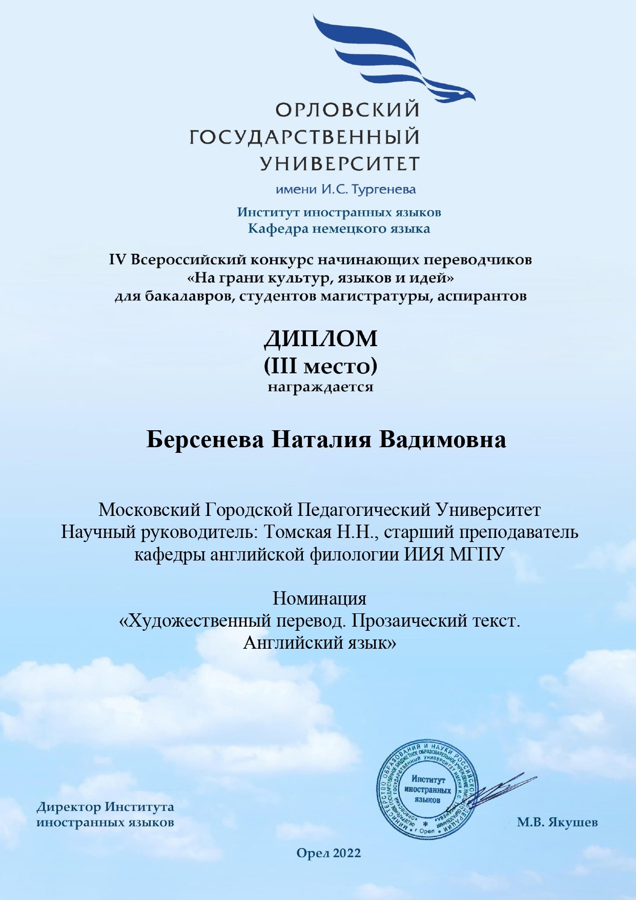 Добрый день! Я студентка МГПУ по направлению "Педагогическое образование. Английский язык". Я влюблена в свою профессию, погрузила себя в языковую среду и с радостью поделюсь своими знаниями с Вами или вашим ребенком.