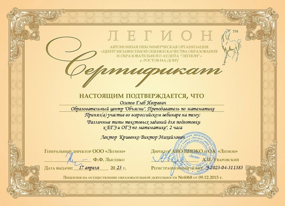 Ребенок самостоятельно ранее готовился к ЕГЭ, но не очень продуктивно. Решили все-таки пибегнуть к услугам репетитора. С Глебом Игоревичем все прошло хорошо, понравилось первое занятие и мы остались на подготовке к экзамену у него.