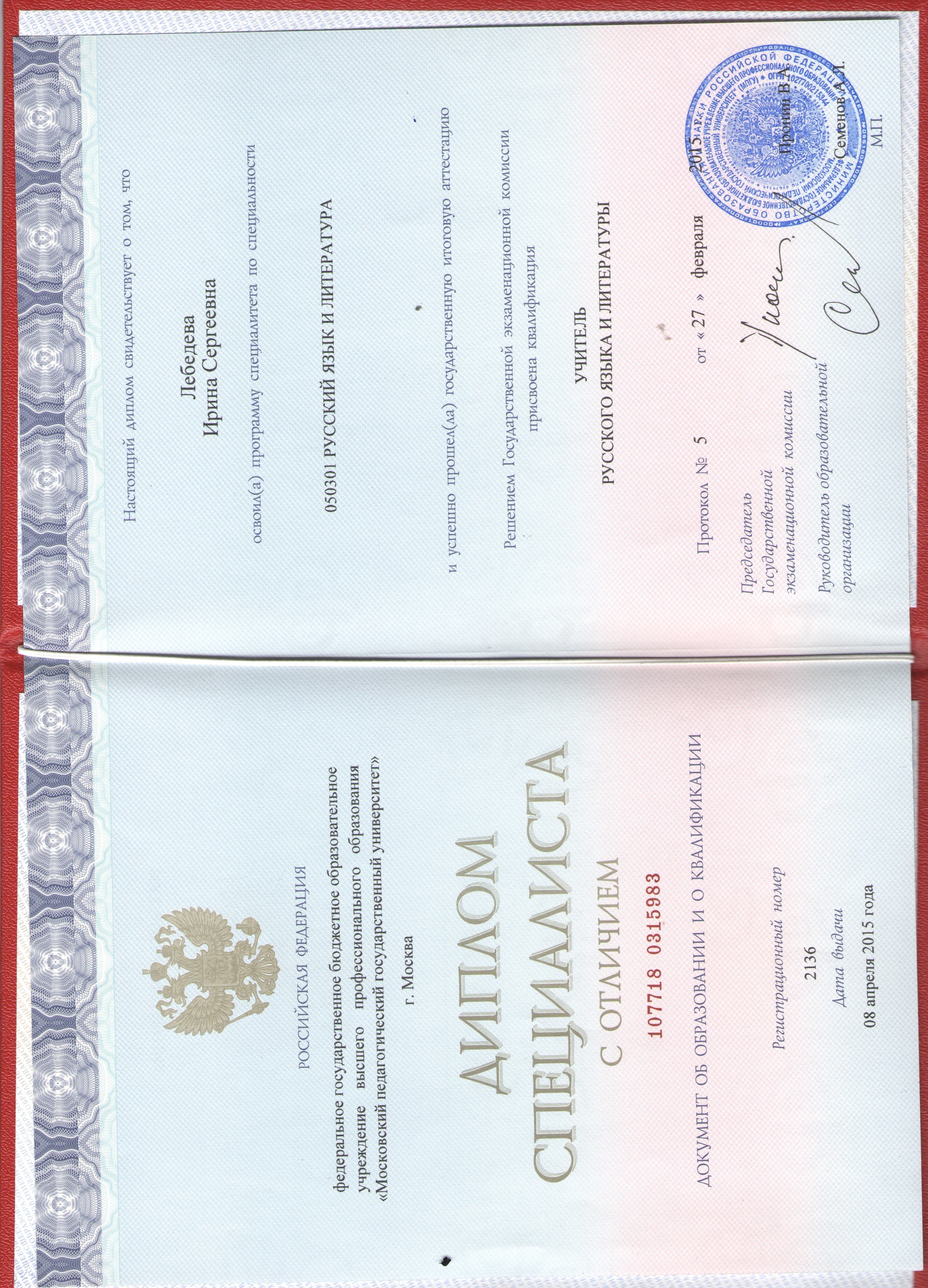 Образование: Московский Педагогический Государственный Университет. Специалитет, филологический факультет, специальность: русский язык и литература, квалификация учитель русского языка и литературы (диплом с отличием). Стаж репетиторства: 5 лет Образование: Московский Педагогический Государственный Университет. Специалитет, филологический факультет, специальность: русский язык и литература, квалификация учитель русского языка и литературы (диплом с отличием). Стаж репетиторства: 5 лет. С 2018 года по настоящее время веду частную педагогическую практику. Преподаю русский язык, занимаюсь подготовкой к школе, к ВПР, ОГЭ, ЕГЭ. Индивидуальный подход к каждому ученику позволяет мне оптимально подобрать программу и методику обучения, тем самым увеличивая скорость развития учащегося. Стараюсь создать творческую атмосферу на уроке, сделать образовательный процесс увлекательным. Среди моих бывших учеников есть студенты ведущих вузов страны: МГМУ им. Сеченова, МПГУ, МГАХИ им. В. И. Сурикова, РХТУ им. Менделеева. Все они сдали ЕГЭ (в том числе по русскому языку) на высокие баллы (от 80+), что и позволило поступить в вуз своей мечты.