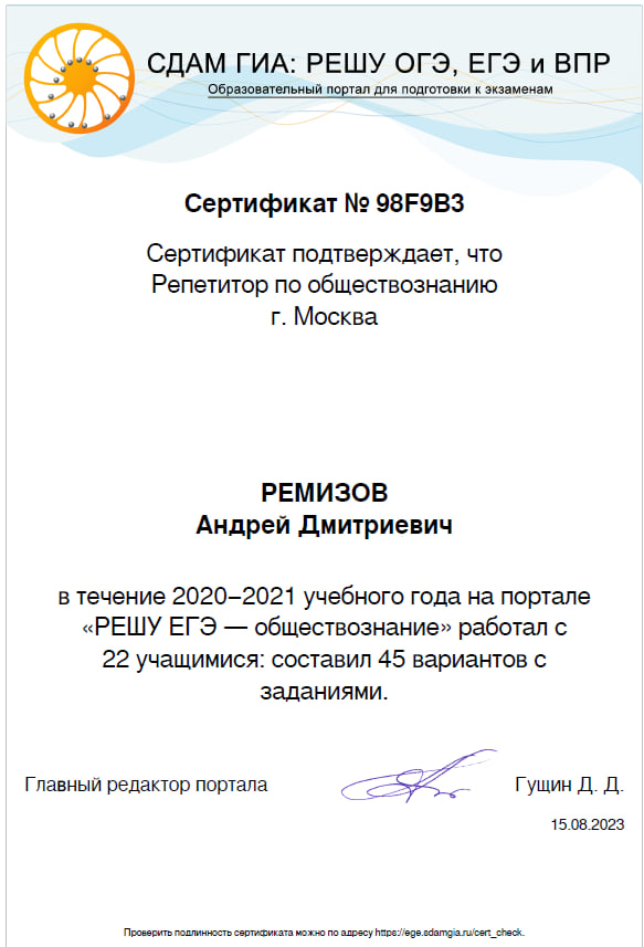 Готовлю школьников к экзаменам с 2013/2014 учебного года. Каждый год лично сдаю ЕГЭ по всем трем предметам, а с результатами 2023 года можно ознакомиться внизу анкеты. Экстерном освоил программу бакалавриата МГУТУ им. К.Г. Разумовского. Мои ученики поступили в МГУ, РУДН, РГГУ, МАИ, ПСТГУ и другие вузы. Ежегодно выпускаю около 30 абитуриентов, помогаю ученикам освоить программу средней школы (до 30 человек). Особое внимание уделяю критериям ФИПИ и слежу за изменениями структур экзаменов. Говорю с ребятами на их языке, стараюсь понять их страхи и вселить уверенность. Примерно так же общаюсь и с родителями.