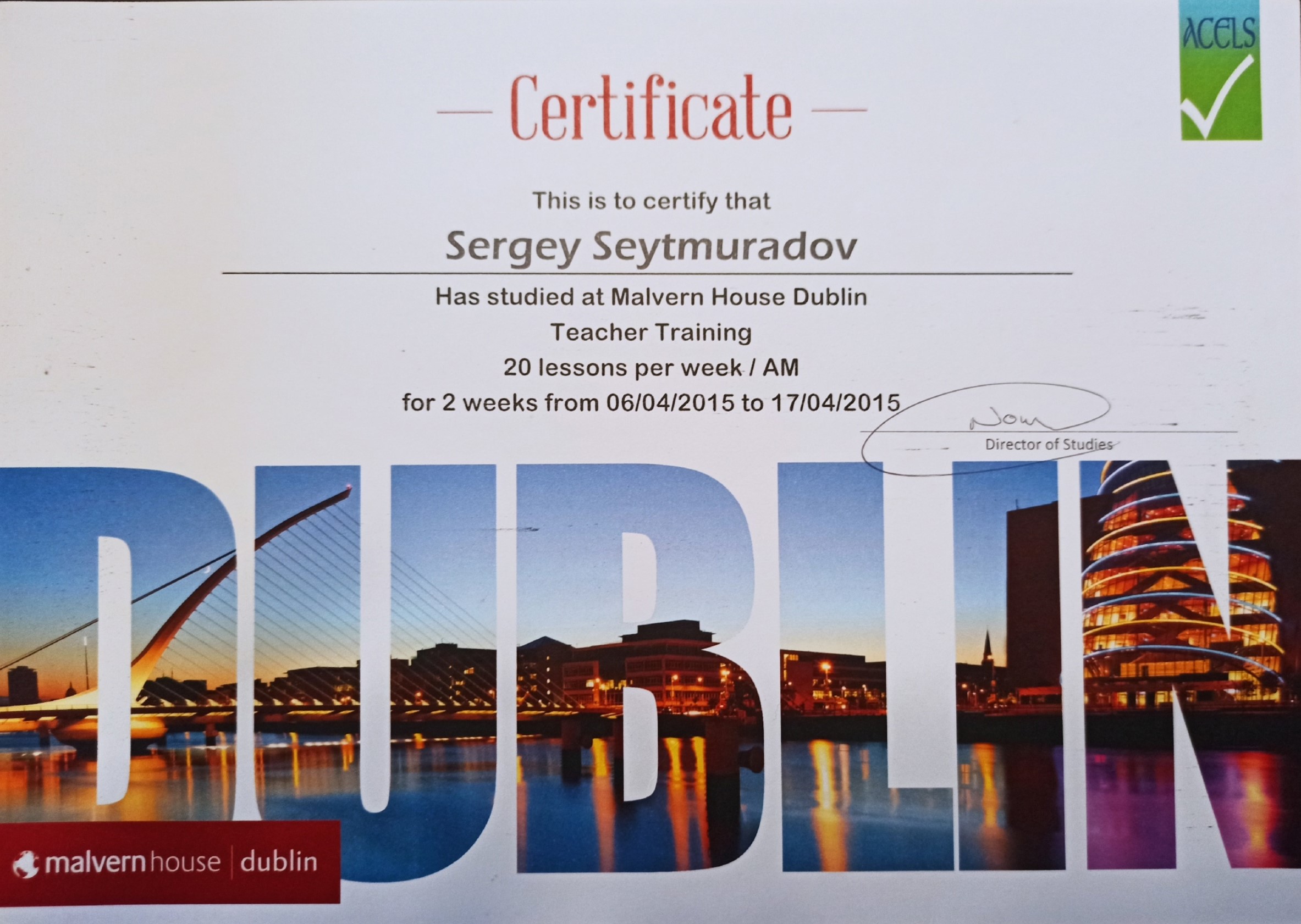 Сертификат о прохождении профессиональной переподготовки в городе Дублин, Республика Ирландия. Теория и методика преподавания английского языка. Тренер преподавателей английского языка