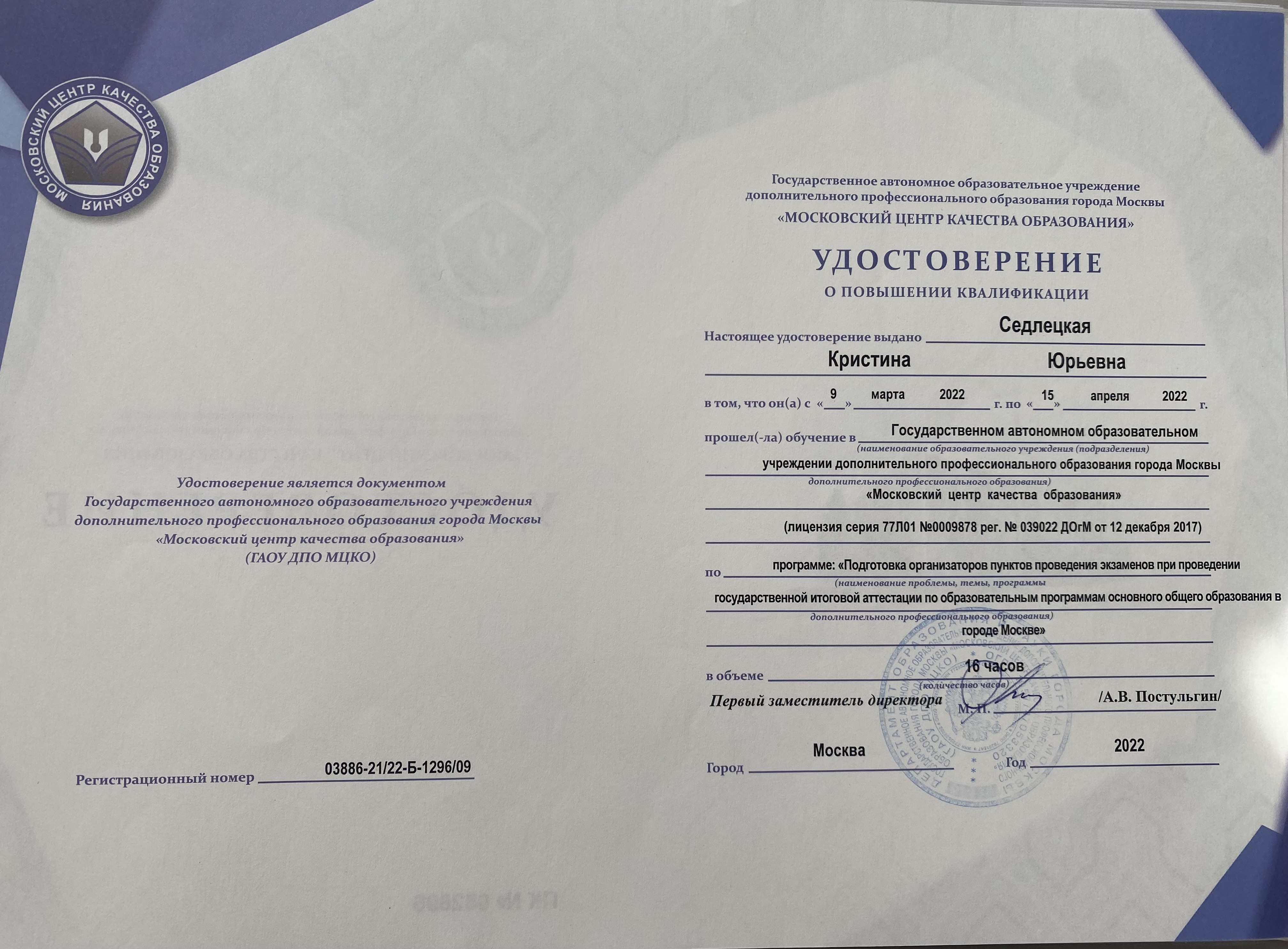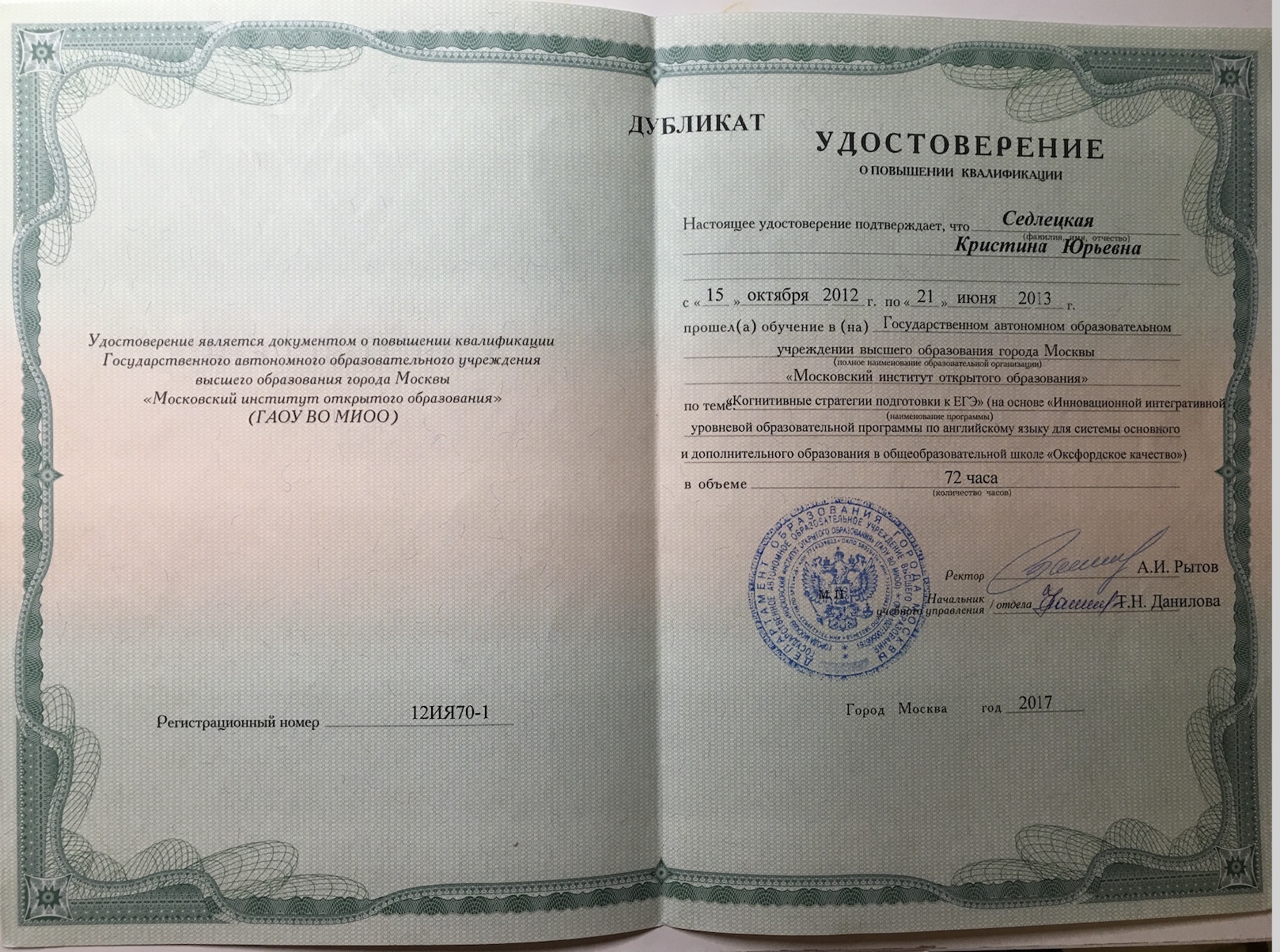 Когнитивные стратегии подготовки к ЕГЭ "Оксфордское качество", удостоверение